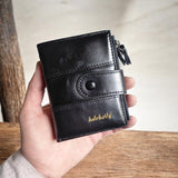 This compact men's wallet combines practical organization with secure storage. Featuring 11 dedicated card pockets, you'll keep all your cards neatly arranged and easily accessible. The dedicated photo pocket displays your most cherished memories, while the spacious main money pocket accommodates bills comfortably. Two zipper pockets provide secure storage for coins and small items, and a hidden zipper secret pocket adds an extra layer of security for valuables. The sturdy button closure ensures nothing falls out during daily use. Built for the modern man who values both functionality and reliability.